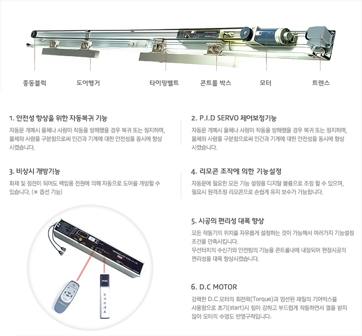 WS-T 시리즈 Microprocessor Controlled Automatic Door는 인간공학적인 기계엔진과 인공지능의 개념이 도입된 Intelligent opertaor에 의하여 작동의 원활함과 고차원적 다기능의 우수한 자동문 제품입니다.
